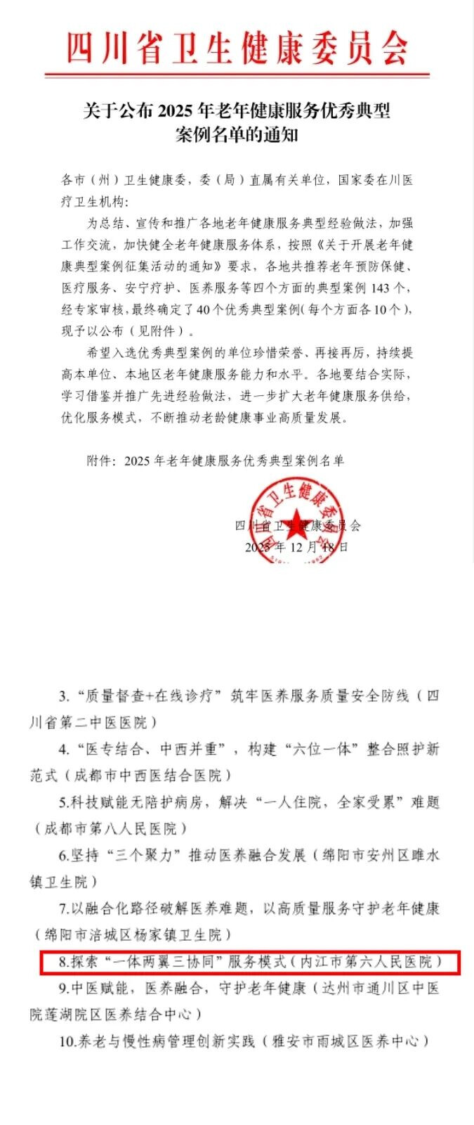 近期,四川省卫生健康委员会公布2025年老年健康服务优秀典型案例名单,内江市第六人民医院报送的《探索“一体两翼三协同”服务模式》从全省143个典型案例中脱颖而出,成功入选医养服务类优秀典型案例,成为全省医养结合领域示范样本,为区域老龄健康事业发展树立起新标杆。
