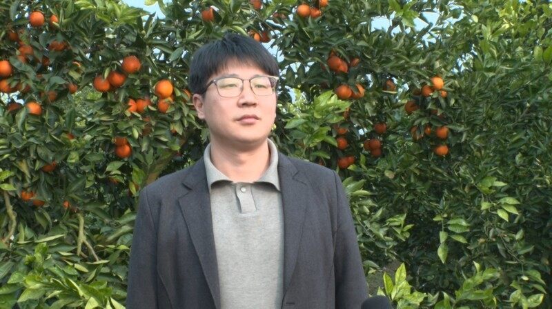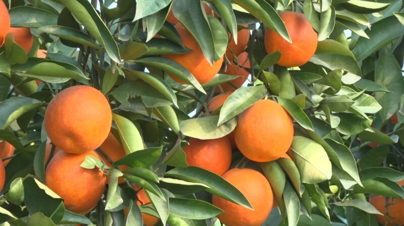 记者万丹丹介绍道:“我现在是在资中县银山镇的资中血橙采摘现场,大家看我手中的这颗血橙,个头饱满、色泽鲜艳!眼下血橙已经成熟,正式开启采摘,一颗颗色泽鲜亮的血橙正从这片沃土出发,即将运往全国各地,甚至远销海外,让全球消费者都能品尝到来自资中的独特鲜甜。”
