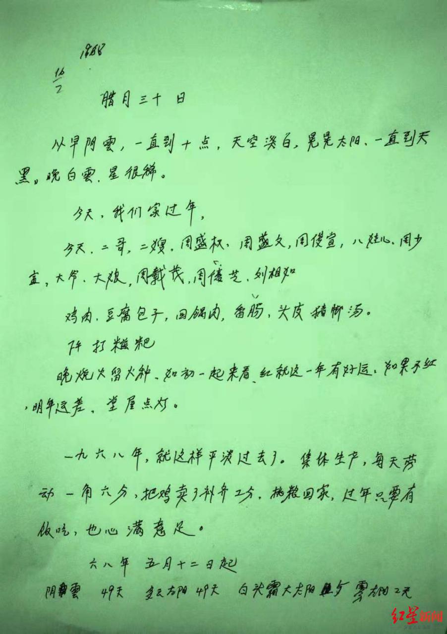 “一九六八年,就这样平淡过去了。集体生产,每天劳动一角六分钱,把鸡卖了补齐工分,挑粮回家,过年只要有饭吃,也心满意足。”1968年除夕之夜,他在日记中如此写道。记工分,分口粮,正是那个年的代他和许多农民的生存实情。