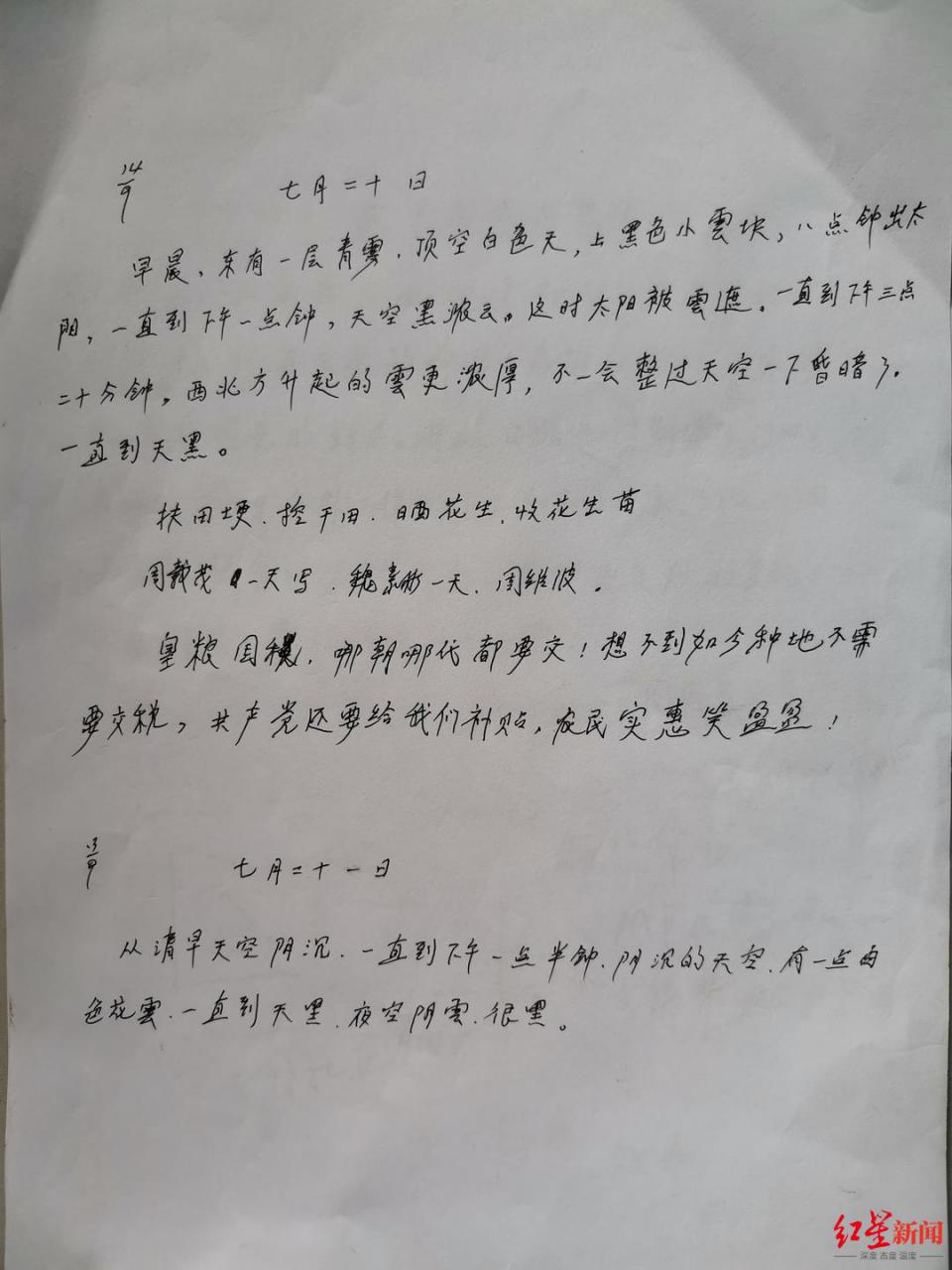6月4日,红星新闻记者翻阅周载茂的日记发现,其中记得最多的便是天气,此外也有周载茂在村子里或走亲串戚、赶集时的所见所闻,包括当地的人情世故、物资价格、生活变化等。日记如同“流水账”一般,时而简单几个词语,时而一天用一张纸记录天气,其中不乏错别字甚至语法错误。但在他的字里行间,也能感受到他眼中乡村在过去半个世纪中的变迁——
