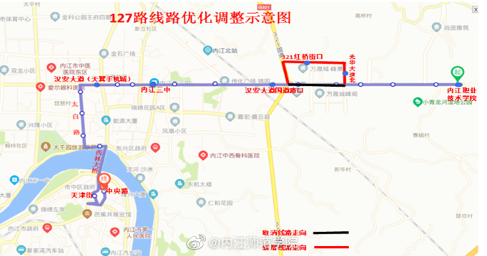 (二)线路走向:内江职院—汉安大道学院路口—滥田冲—东兴区人民法院—光华大道北—师院新区—321红桥街口—汉安大道国道路口—汉安大道东城路口—汉安大道东兴大道路口—内江三中—西林批发市场—汉安大道西林大道路口—汉安大道(天翼手机城)—北京华联购物中心—太白路农发行—太白路—东桐路口—天津街—中央路