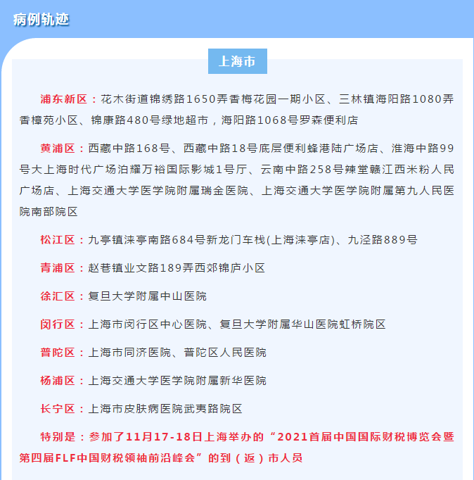 11月27日,上海市新冠肺炎疫情防控工作领导小组办公室发布消息:2021年11月25日,上海市报告3例新冠肺炎本土确诊病例。经市疾控中心实验室基因测序并经中国疾控中心确认,3例病例所感染的新冠病毒为Delta变异株,病毒序列高度同源,为同一传播链。经中国疾控中心和上海市专家综合流行病学调查以及病毒基因数据库检索比对分析,认为此次3例本土确诊病例的感染来源可以聚焦在:在外省市暴露于境外输入病毒污染的环境而引发的感染。