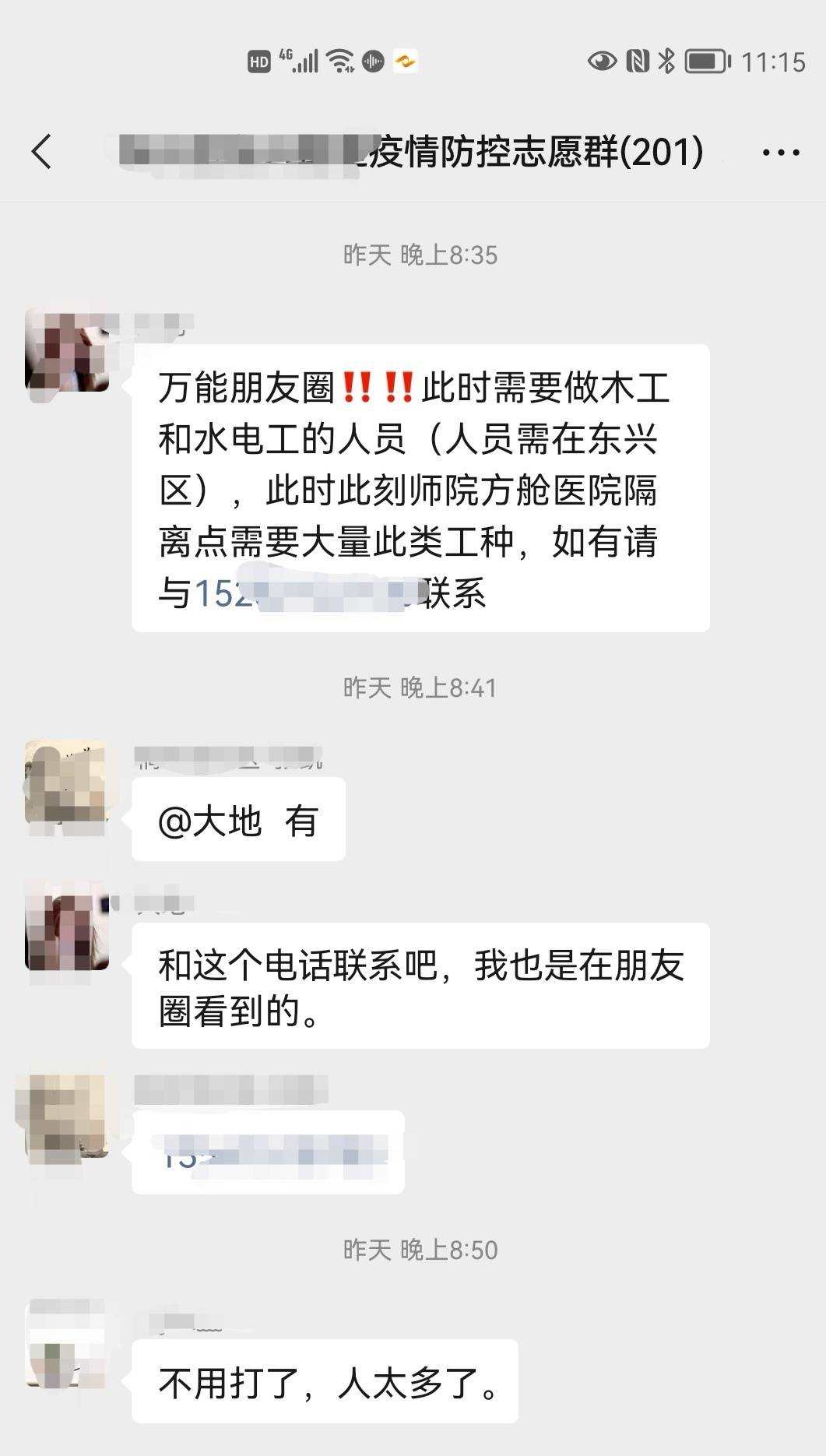记者在一个疫情防控志愿群里看到,一名网友发布信息称:万能朋友圈,此时需要做木工和水电工的人员(人员需在东兴区),此时此刻师院方舱医院隔离点需要大量此类工种,如有请与152********联系。