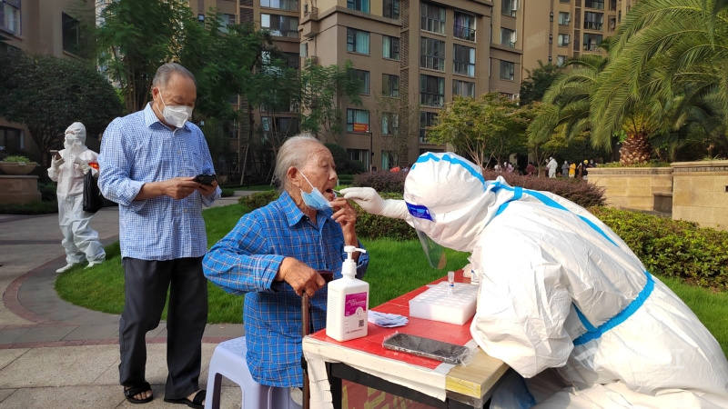 今天上午,家住东兴区西林街道碧云社区邦泰国际小区的98岁老人彭富珍,在儿子的陪同下拄着拐杖来到核酸检测集中采样点完成了核酸采样。