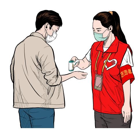 5、志愿者在为他人提供志愿服务时,要时刻与服务对象保持安全距离,尽量减少直接接触。加强手卫生,接触污染后应立即进行手消毒或更换手套。