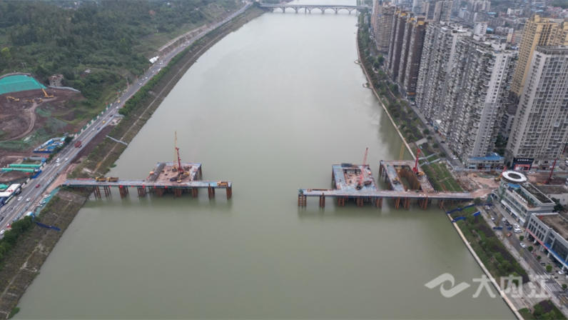 在市级重点项目内江麻柳坝大桥及连接线工程项目施工现场,挖掘机、打桩机、装载车等大型机械设备正高速运转,工人们正在进行钢筋绑扎、水中桩基维护等工作。