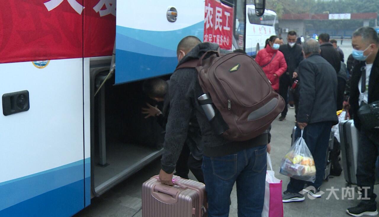2月8日,记者在内江高速公路客运中心看到,几辆带有“春风行动”返岗专车字样的大巴整齐停放在站内,返岗农民工在工作人员的指引下有序登车。