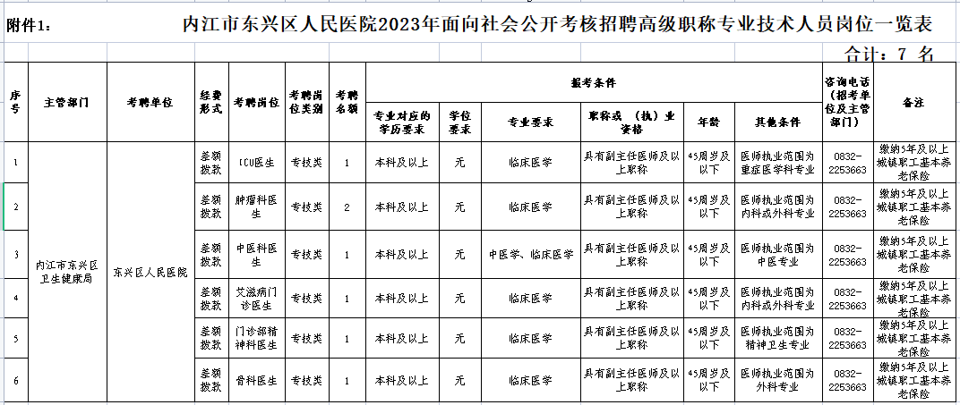 具体考聘单位及岗位名额、条件详见《内江市东兴区人民医院2023年面向社会公开考核招聘高级职称专业技术人员岗位一览表》