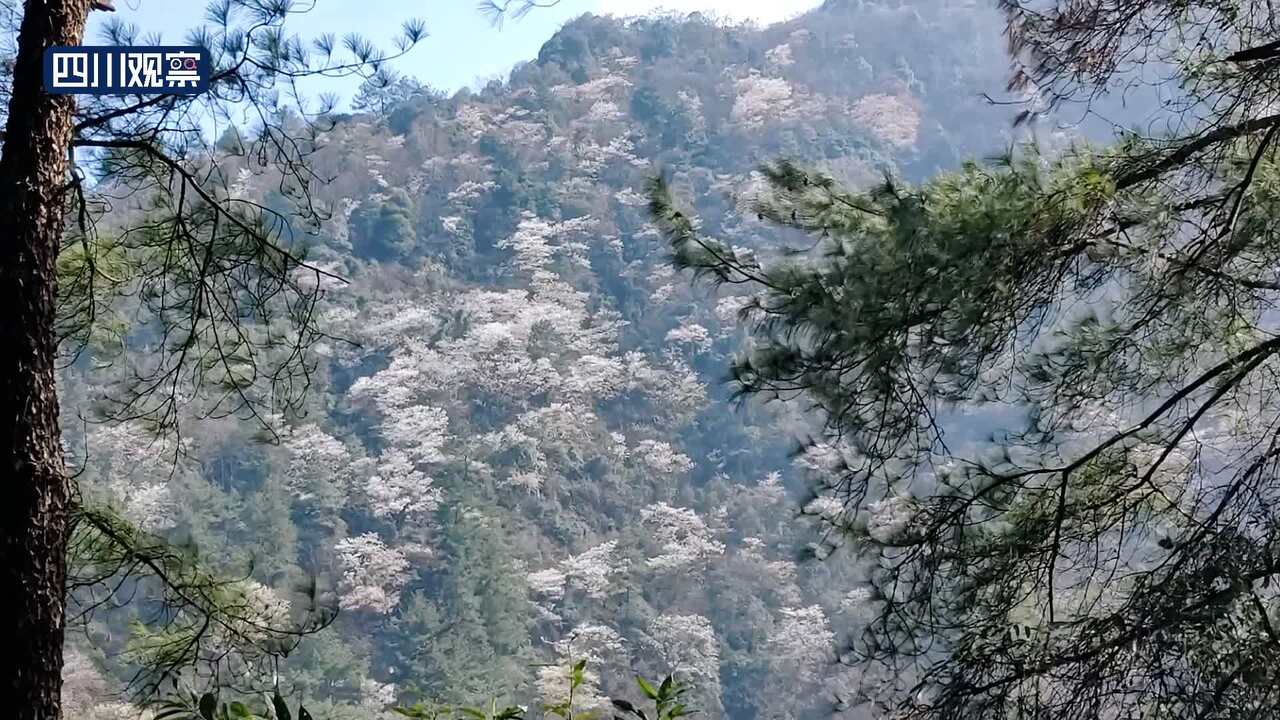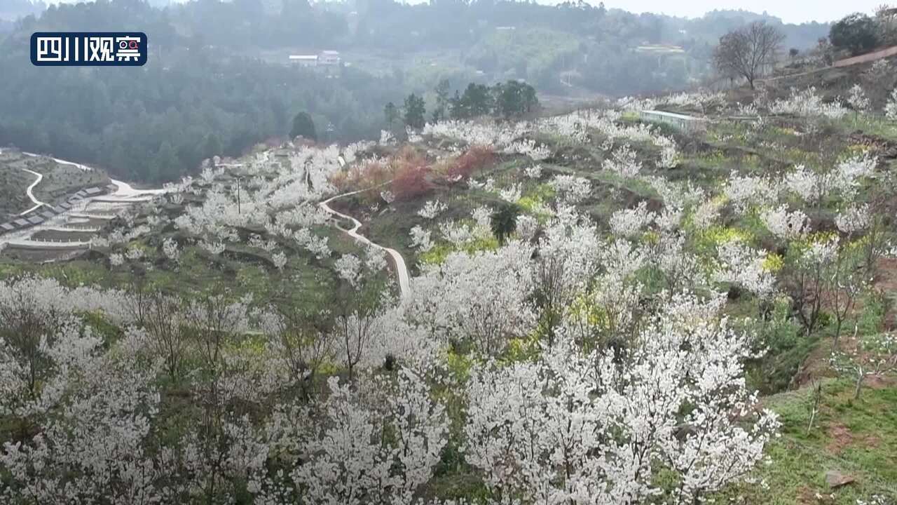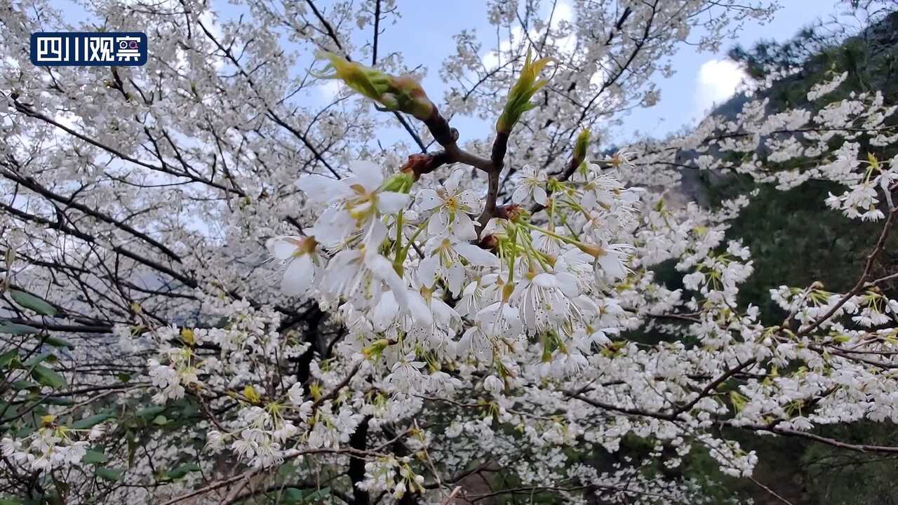 广安华蓥山万亩野樱桃花,从山脚到山顶次第开放,与青山绿树交相辉映。野樱桃花洁白淡雅,花海如潮,呈现出诗画般的锦绣春色。野樱桃花花期将持续到3月中旬。
