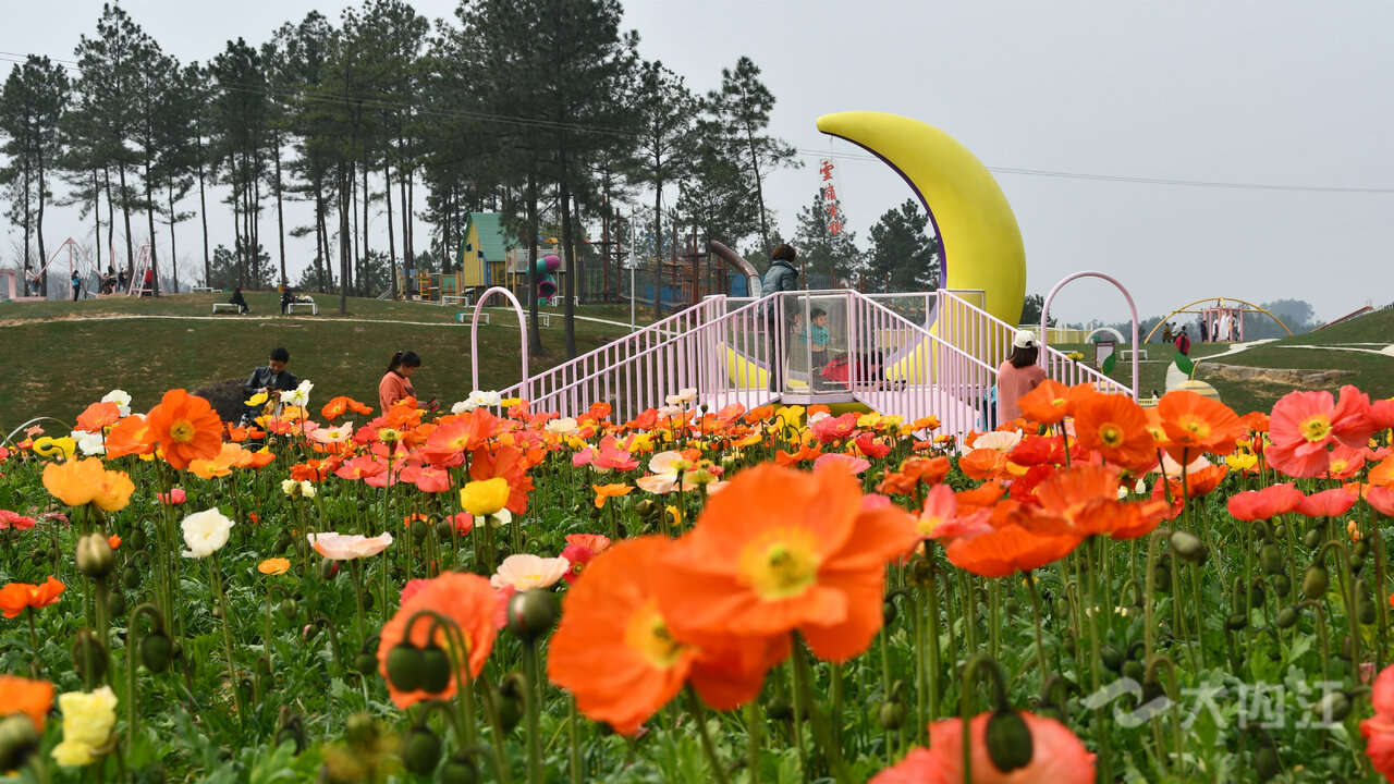 放眼望去,景区中除了樱花,还有雪白透亮的樱桃花和梨花、五彩斑斓的虞美人,游客们畅游其中,或是拍照留影,或是赏花游玩,感受这份独属于春日的悠闲惬意。