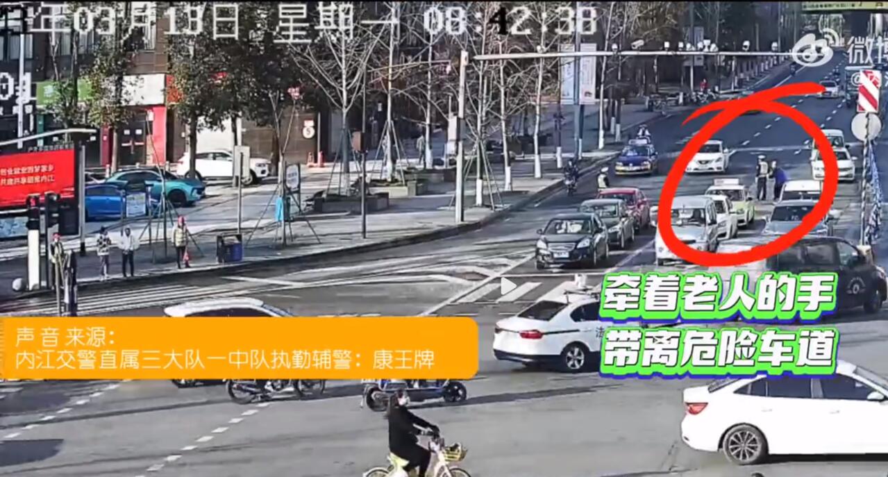 时间:2023-03-15 11:03:38 来源:内江交警三大队微博2023年3月13日,内江市交警支队直属三大队执勤辅警康王牌在内江经开区汉渝大道与甜城大道交汇路口执勤时,发现一位老人在道路中心扶着隔离护栏,立即上前询问。
