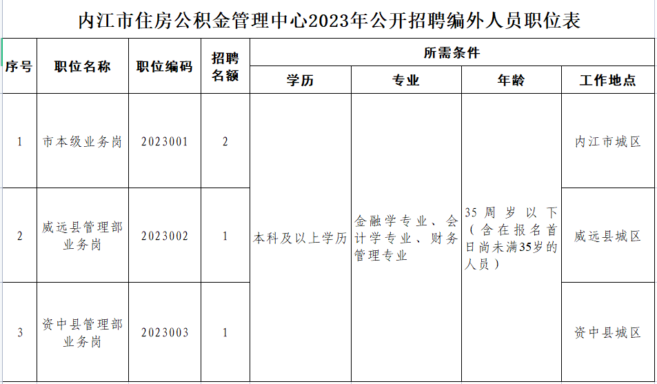 本次公开招聘编外人员4名,具体的岗位名额、资格条件等详见《内江市住房公积金管理中心2023年公开招聘编外人员职位表》。