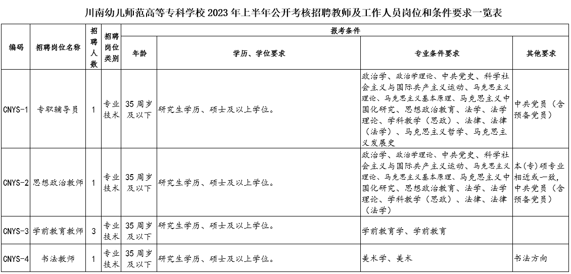 时间:2023-04-03 17:27:55 来源:内江人事考试网江粉儿从内江人事考试网获悉,川南幼儿师范高等专科学校面向社会公开考核招聘教师及工作人员6名。详情如下: