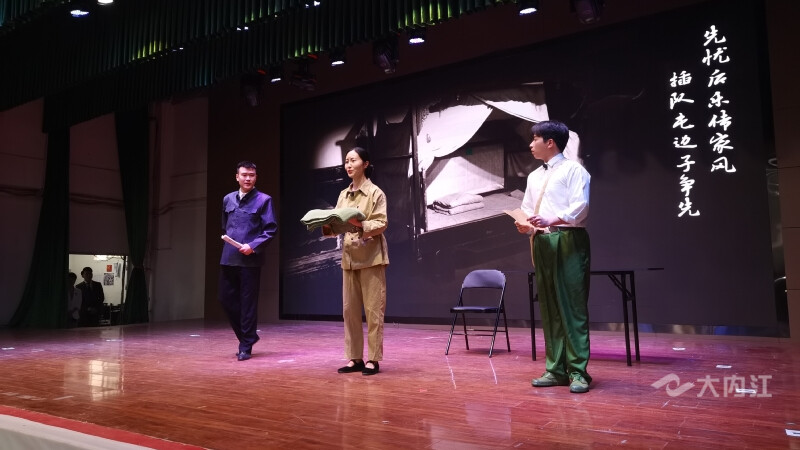讲台上,“理响甜城”宣讲队队员围绕“手无寸铁兵百万,力举千钧纸一张”“以笔为枪捍真理,将文作刀战沙场”“家国情怀铸丹心,长江家风美名扬”“长江自有后来人,不尽长江滚滚来”等主题,结合声乐、光影,深情讲述了范长江先生的生平事迹、革命经历和家风故事,生动展现其正直立身的可贵品行、追求真理的斗争精神和深厚炽热的爱国情怀。