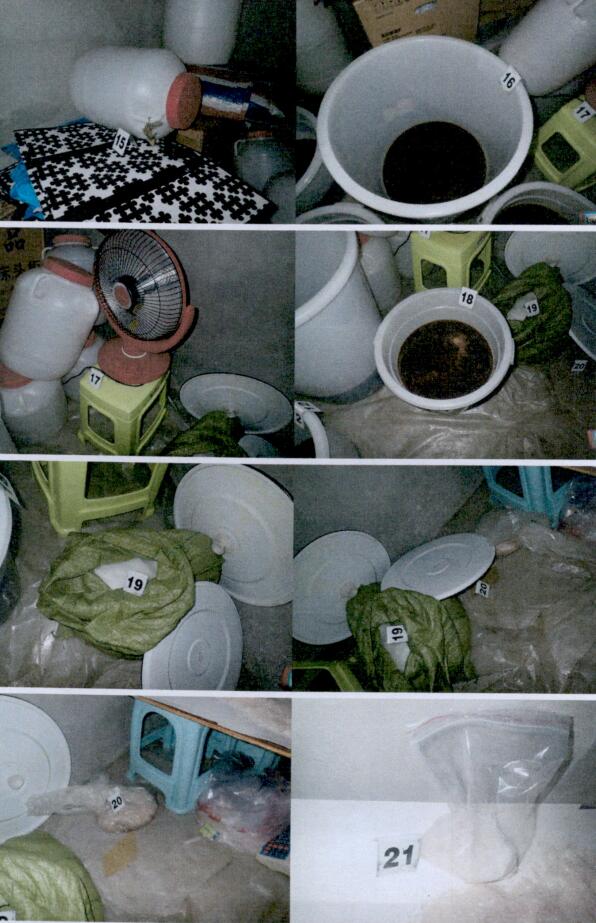 △王某辉放在屋后屋檐下用“花胶布”覆盖的疑似毒品冰毒,共计十五桶