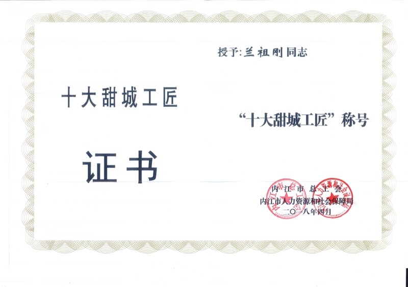 因扎实的工作,近年来,兰祖刚先后荣获内江市“十大甜城工匠”、“内江市五一劳动奖章”等荣誉,2020年被聘为“内江市首席技师”、被评为四川省第八届劳动模范。一个劳模就是一面旗帜,一名工匠就是一座灯塔。一路走来,兰祖刚从一个不知数控机床为何物的门外汉成长为如今满载荣誉的数控车工能手,他以“干实事”为笔,书写了新时代产业工人的精彩人生。