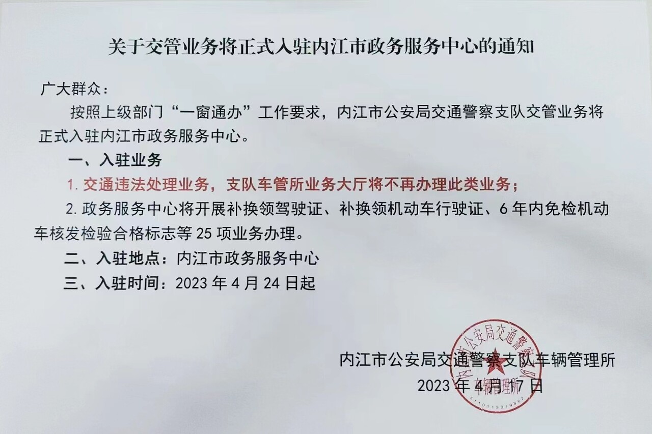 时间:2023-04-18 10:47:25 来源:内江市公安局交通警察支队车辆管理所江粉儿从内江市交警支队车管所获悉,4月24日起,内江市交警支队车管所的交管业务将正式入驻内江市政务服务中心,届时支队车管所业务大厅将不再办理交通违法处理业务,详情如下。