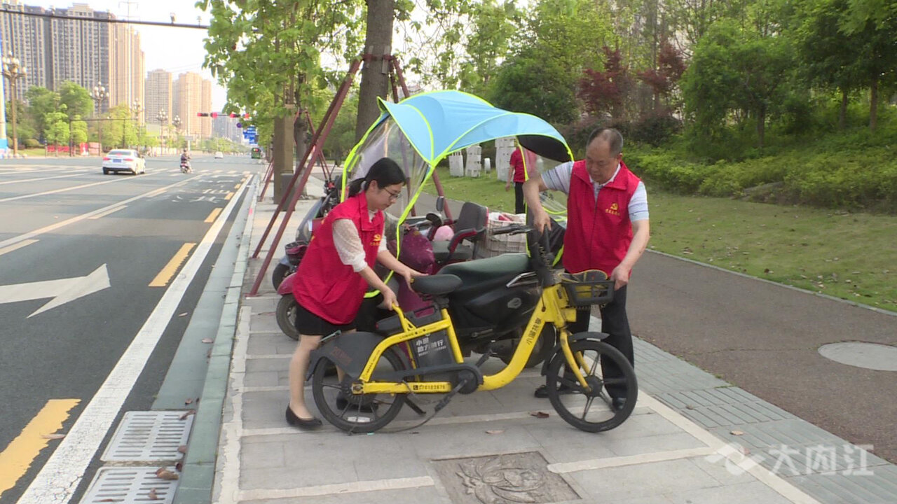 ▲志愿者规范共享单车停放