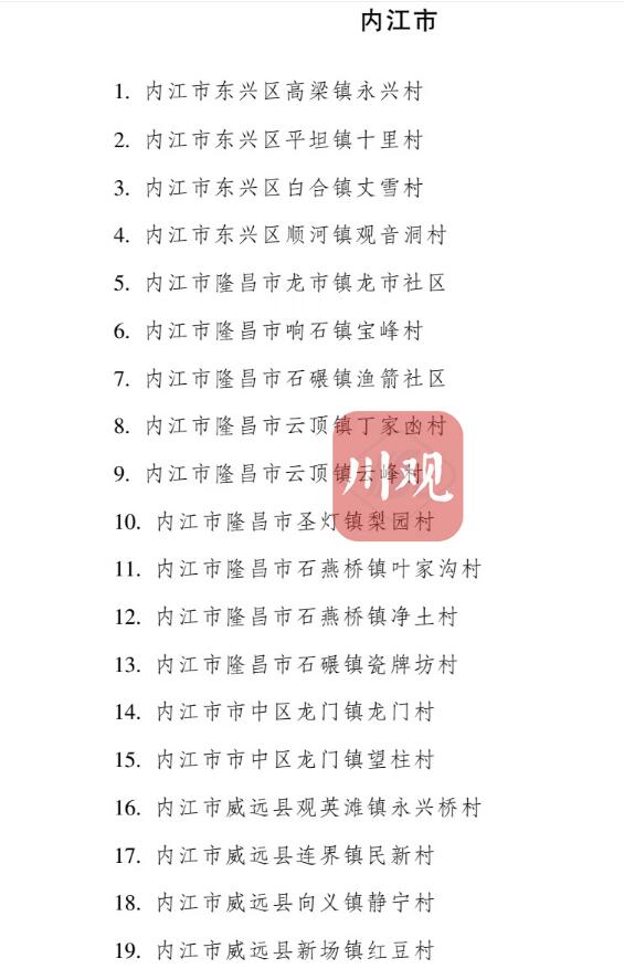 时间:2023-04-19 11:05:28 来源:川观新闻江粉儿从“四川省政府网”获悉,根据《四川省传统村落保护条例》,经各地申报、专家审查并向社会公示,省政府决定将1165个村落列入四川传统村落名录,其中内江25地上榜,现予公布,详情如下: