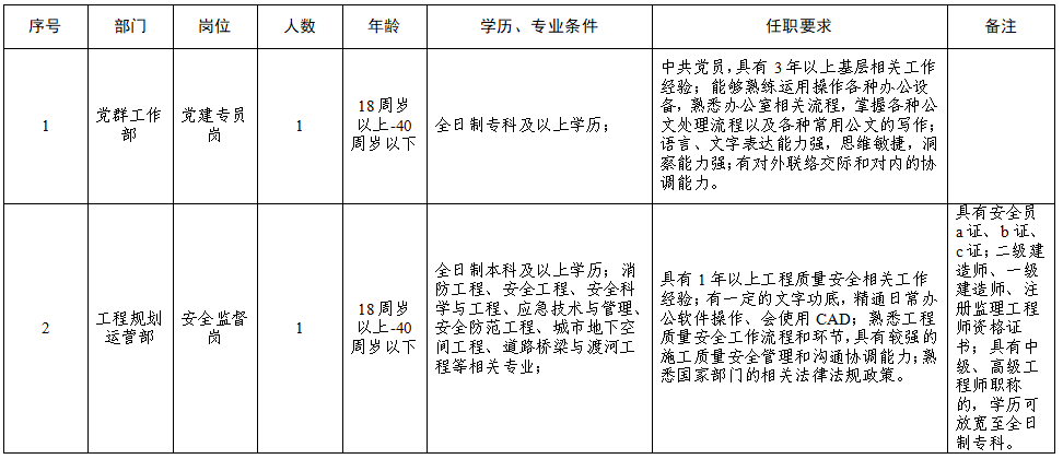 资中县润资水务投资开发有限责任公司拟面向社会公开招聘人员8名,其中:党建专员岗1名、风控岗1名、安全监督岗1名、质量监督岗1名、投资岗1名、融资岗1名、会计岗1名、资产管理岗1名,现将有关事宜公告如下。