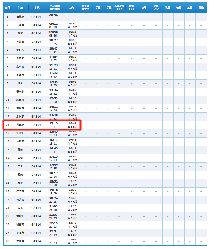 (1)桂林北-太原南G4114次:内江北15:11/13