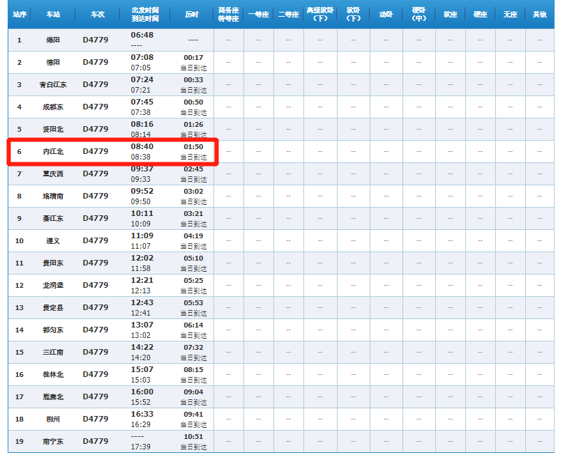 (2)绵阳-南宁东D4779次:内江北8:38/40