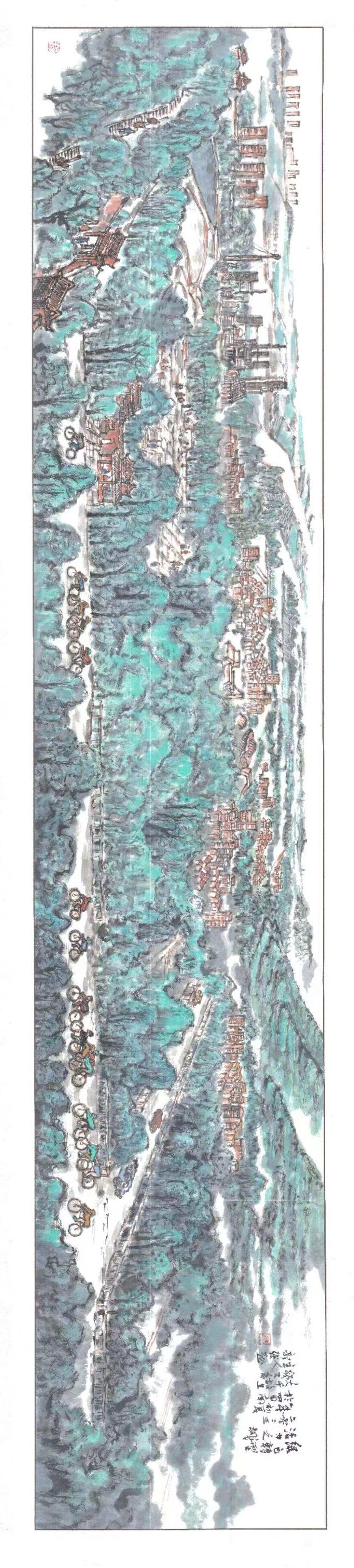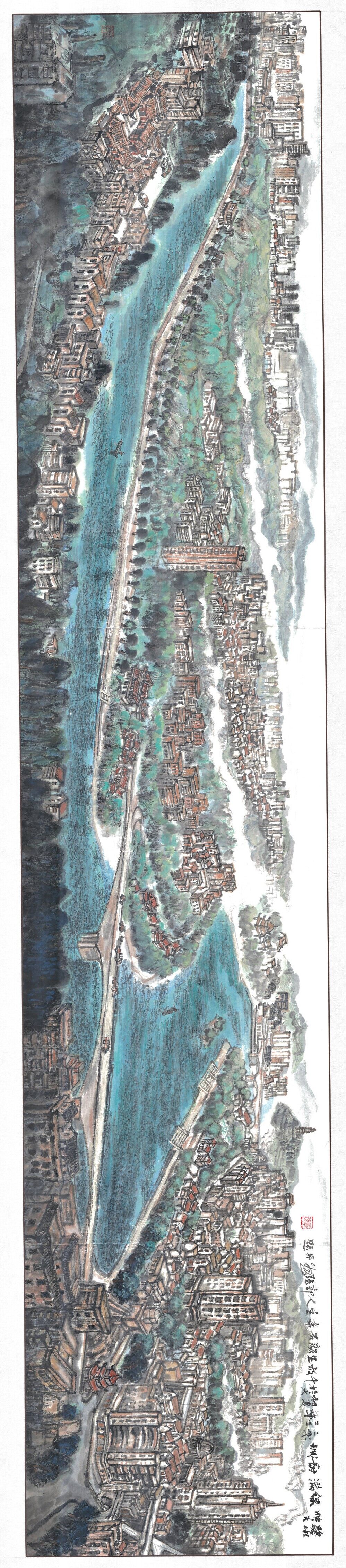 访谈中,邹自景书记用三幅国画介绍了内江如何以绿色筑底“甜蜜之城”,其中,第一幅画叫《碧水映天 绿满甜城》。在这幅画里,沱江穿城而过,甜城绿道沿江勾画出整个城市的轮廓,绿地公园、生态湿地分布其中,可以说是内江优美生态环境的真实写照。