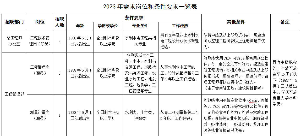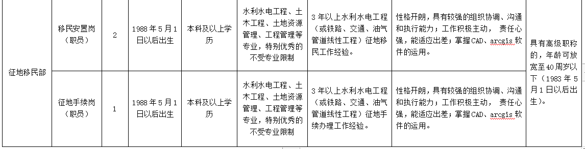根据《四川省水利发展集团有限公司子公司人才引进管理办法(试行)》和《四川省向家坝灌区建设开发有限责任公司员工招聘录用管理办法》规定,结合公司工程建设及发展需要,拟面向社会公开招聘人才。现将有关事项公告如下: