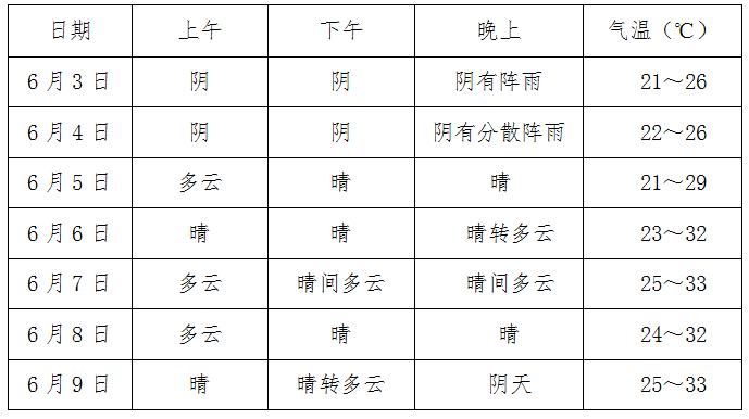预计内江市2023年高考期间(6月7日~9日),天气以晴间多云为主,无明显降水,最低气温24~25℃,最高气温32~33℃。