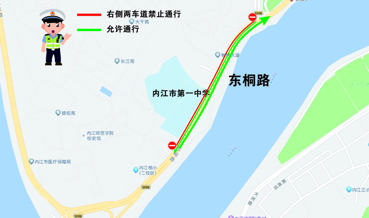 1、内江一中考场管制路段:东桐路(大千路口至桐梓坝大桥方向)右侧两车道禁止车辆通行;