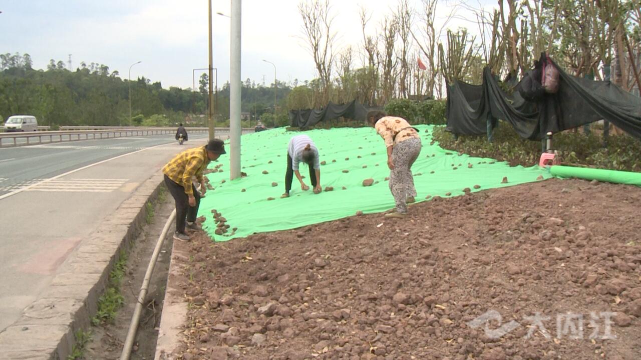 6月5日,记者在国道321线东兴区城区段道路看见,沿线日常保洁和绿化、美化工作正在持续进行中。保洁人员正在对路侧沟渠进行清理并拾取沿路垃圾,清洁车辆正在对道路路面及护栏、隔离栏进行冲洗擦拭、洒水降尘。而另一处,绿化工人正在对新种植的绿化带草籽覆盖保湿布,促进绿化草坪快速生长。
