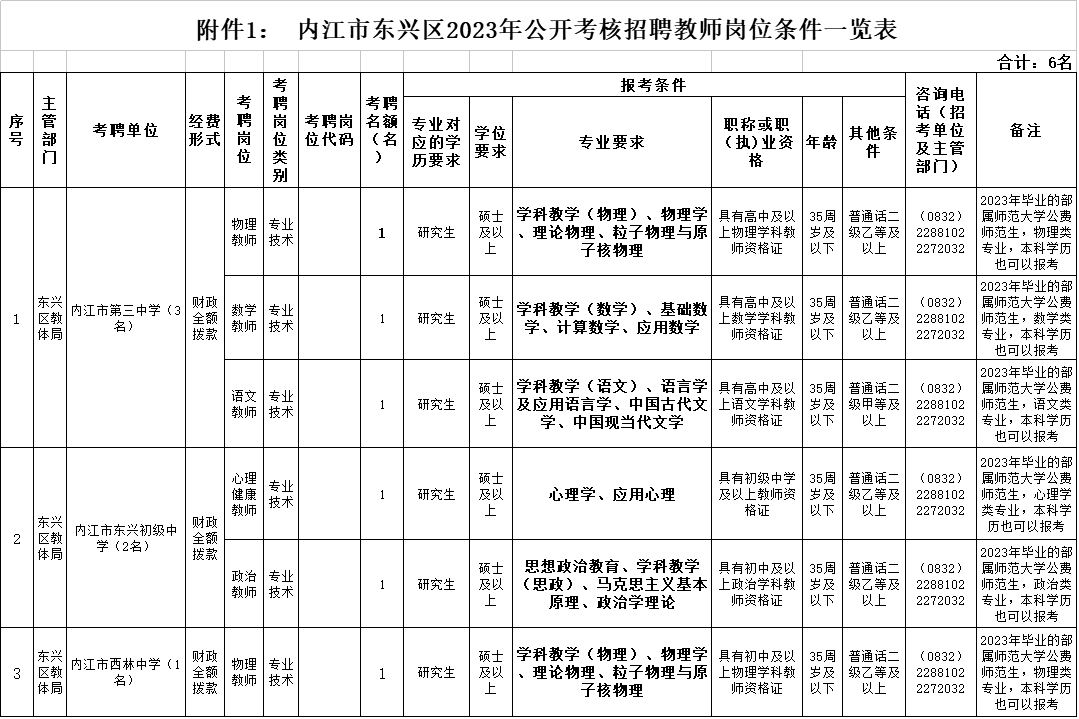 考核招聘岗位及名额:详见附件1:《内江市东兴区2023年公开考核招聘教师岗位条件一览表》。岗位类型:专业技术;经费形式:财政全额拨款。