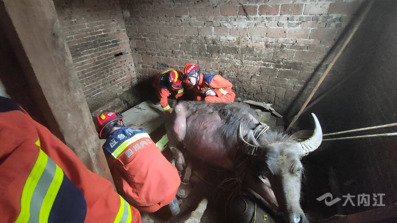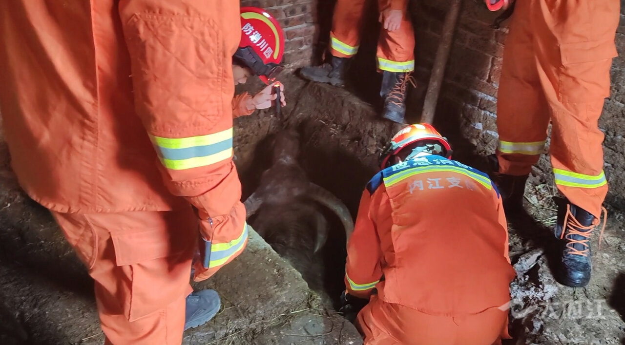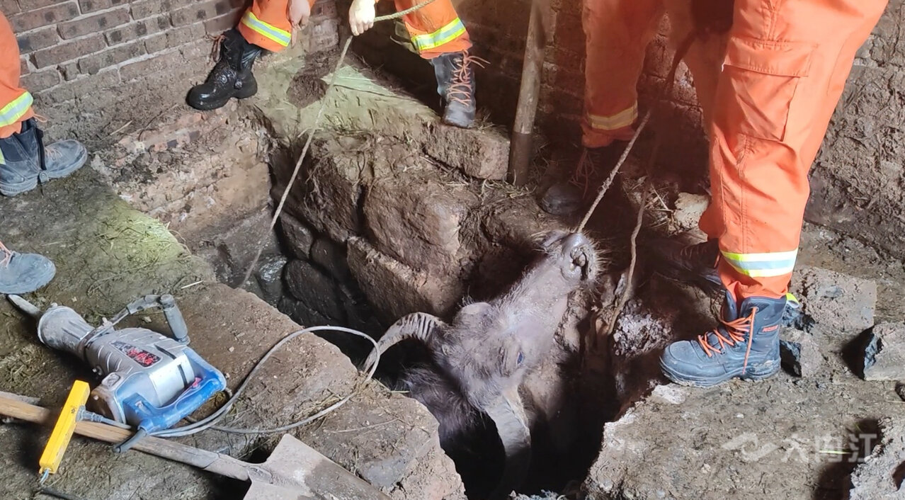 800斤水牛掉坑里 消防助其脱困