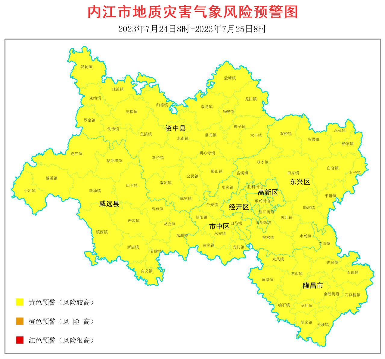 时间:2023-07-24 09:58:15 来源:内江市地质灾害指挥部办公室7月24日,内江市地质灾害指挥部办公室发布最新地质灾害气象风险预警结果,详情如下