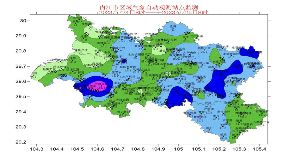 7月24日白天,我市出现了一次雷阵雨天气过程,雨量普遍中雨到大雨,市中区、东兴区、威远县、资中县局部地方暴雨,威远县三个站点出现大暴雨,全市148个观测站中大暴雨站3个,暴雨站14个,大雨站55个,中雨站57个,小雨站18个,最大降水出现在严陵龙泉,为163.6毫米,其最大小时降水为84.1毫米。降雨的同时出现了6-7级阵风,最大风力出现在东兴区东兴站,为16.7m/s(7级)。(具体雨量见附表)