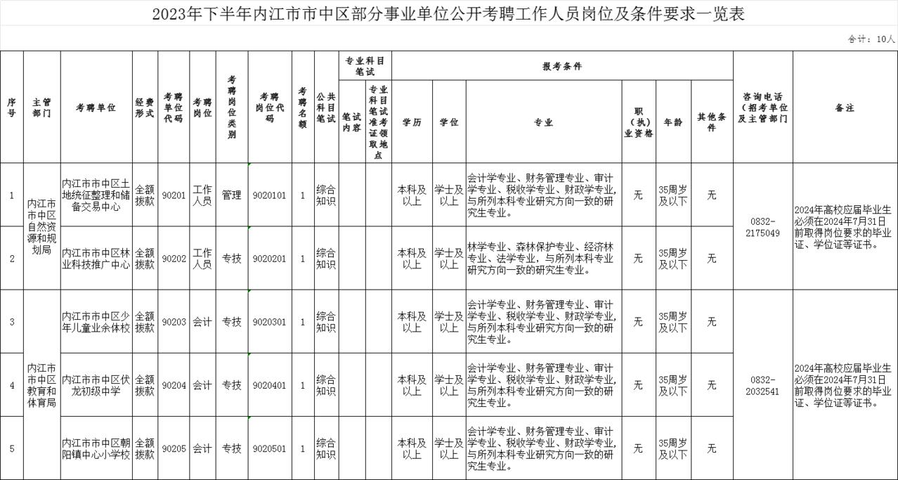 2023年下半年内江市市中区部分事业单位将面向社会公开考聘工作人10名。