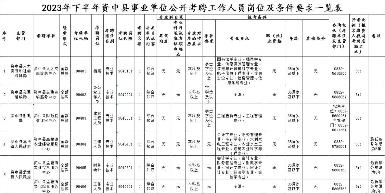 考聘岗位所需的具体条件及资格要求,详见《2023年下半年资中县事业单位公开考聘工作人员岗位及条件要求一览表》。
