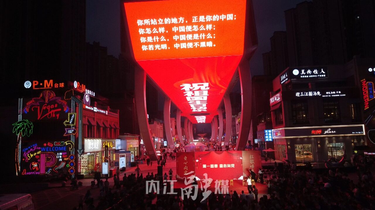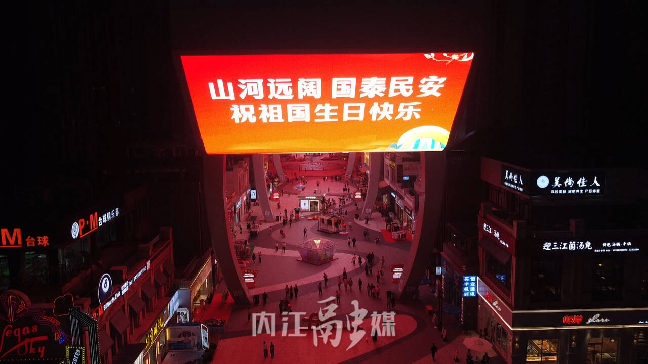 9月28日晚上八点,在内江高新区万晟天街一块长300米、宽25米的中国西南最大的单体户外led屏“点亮”了国庆中秋假日前夕的夜空,庆祝中华人民共和国成立74周年,引来众多市民和游客拍照留念。