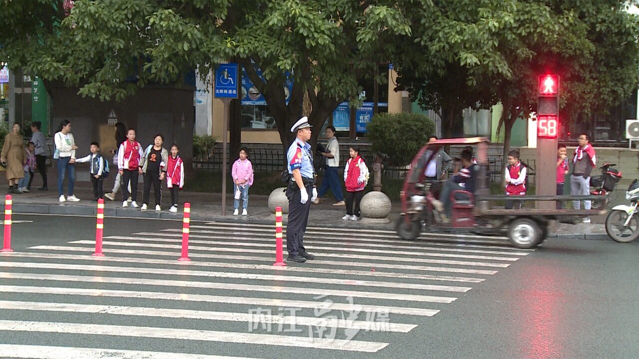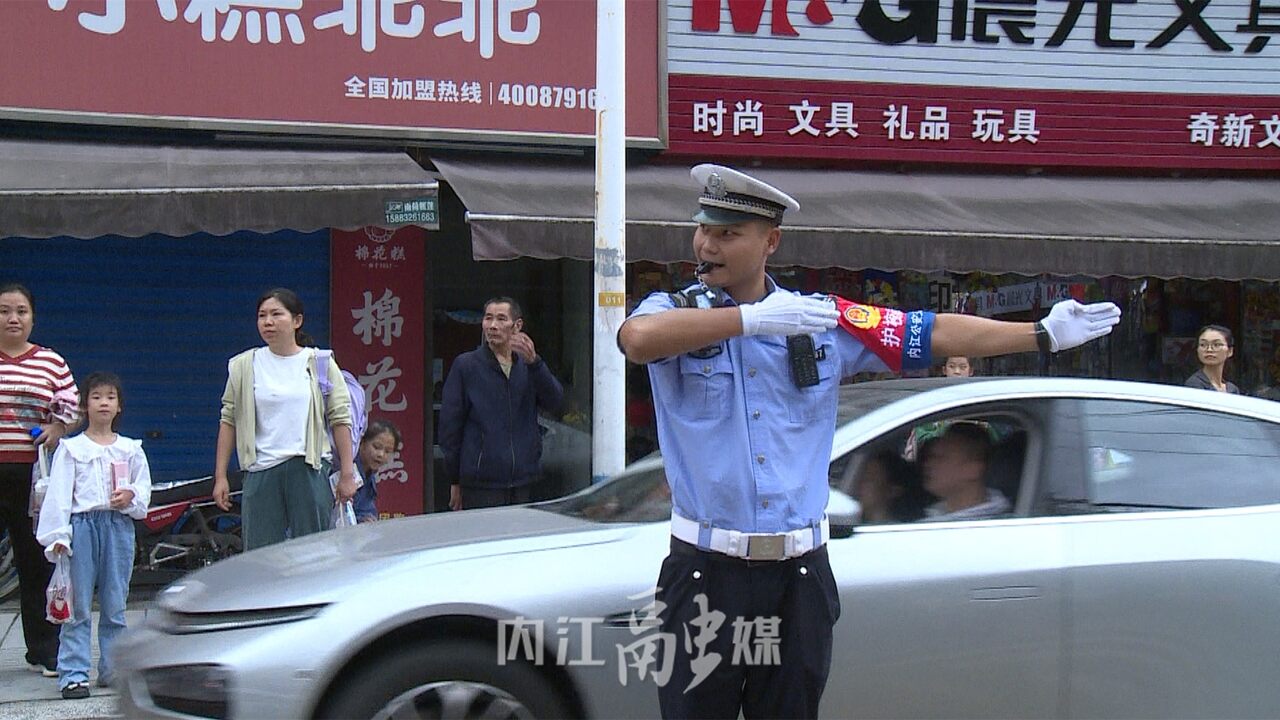 内江交警直属三大队二中队辅警刘宇:“每天早晚上下学高峰期我们会安排护校人员在学校门口执勤,指挥交通保障学生安全通过马路,尤其是下午放学车流量人流量大的时候,我们会对车辆临时管控,保障学生和家长安全的通过人行横道。”