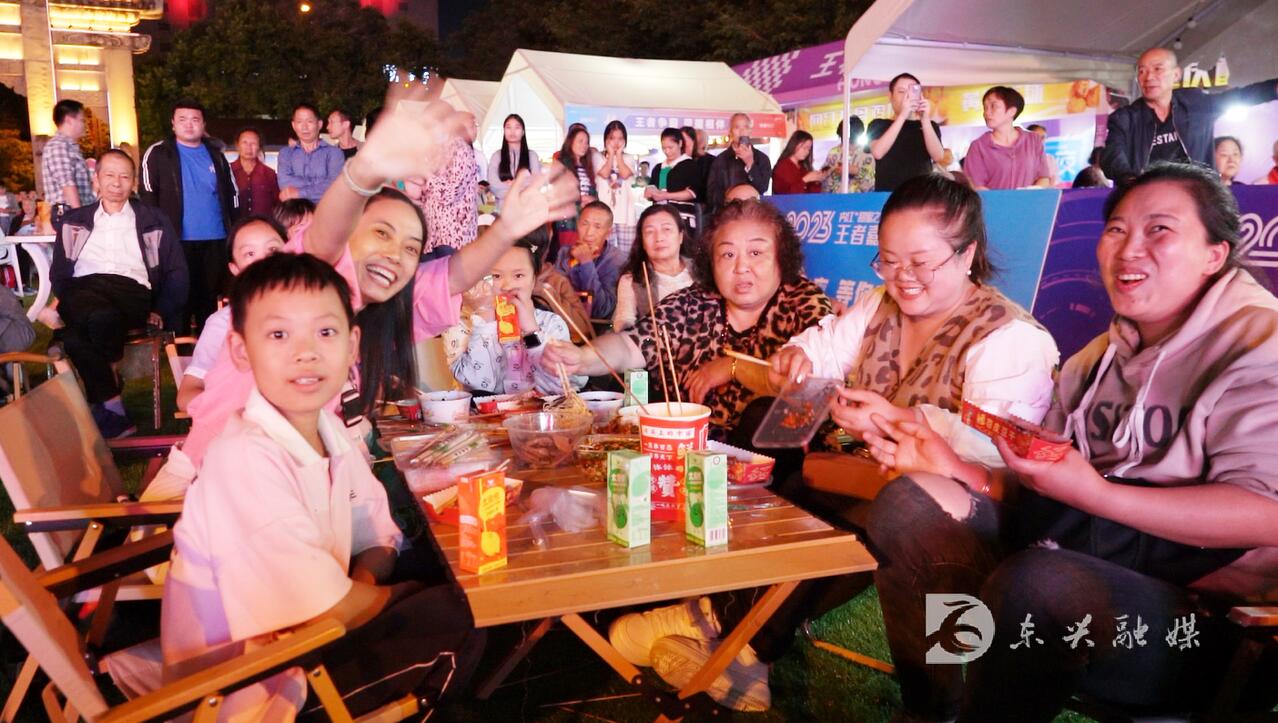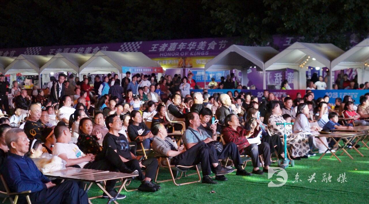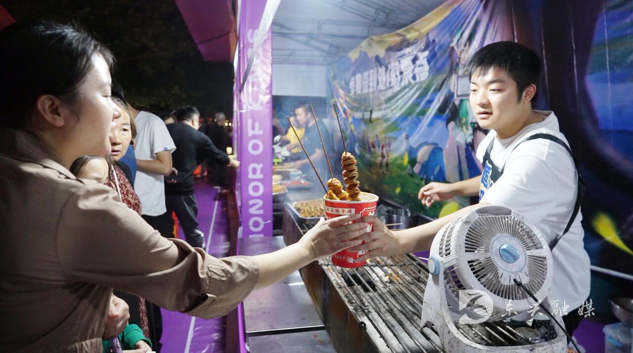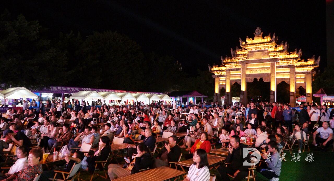 当晚8点,大千园广场,热闹非凡。各色集市让你一站式吃喝乐购,众多市民纷纷前来赶赴盛宴。米粉店、烧烤店干货店热火朝天,买完小吃来到观众席就座,边品美食、边看节目,精彩的节目燃爆全场,人们纷纷拿出手机记录这一美好的时刻。
