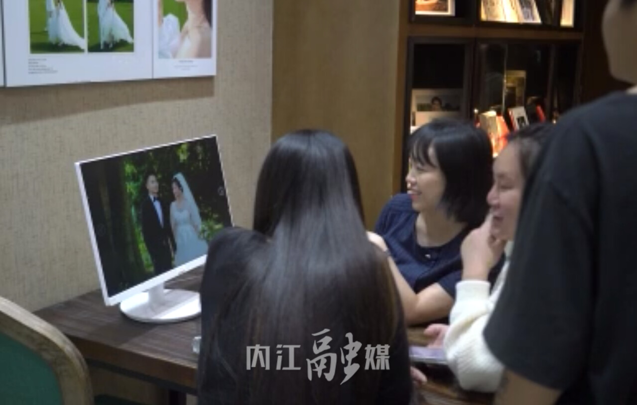 与此同时,一些准新人也趁着假期的空档拍摄婚纱照,在市中区大同街一婚纱影像馆,前来选照片和咨询的人络绎不绝,工作人员忙得不亦乐乎。