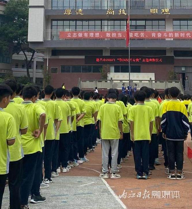 时间:2023-10-01 10:49:55 来源:i内江9月28日,由共青团隆昌市委和市教体局组织的“强国复兴有我”升国旗仪式,在隆昌市城关职业中学操场举行。