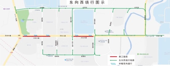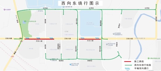 汉安大道东段(国道321交叉口至高桥西路交叉口)、汉安大道东段(光华大道交叉口至高桥东路交叉口)实施半幅封闭,半幅双向通行,施工路段汉安大道剩余通行车道数为双向四车道。
