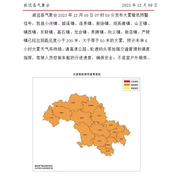 12月9日早上,资中县气象台、威远县气象台发布大雾橙色预警信号,详情如下。