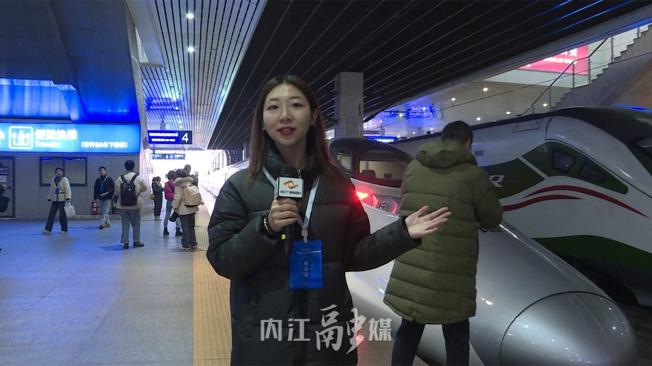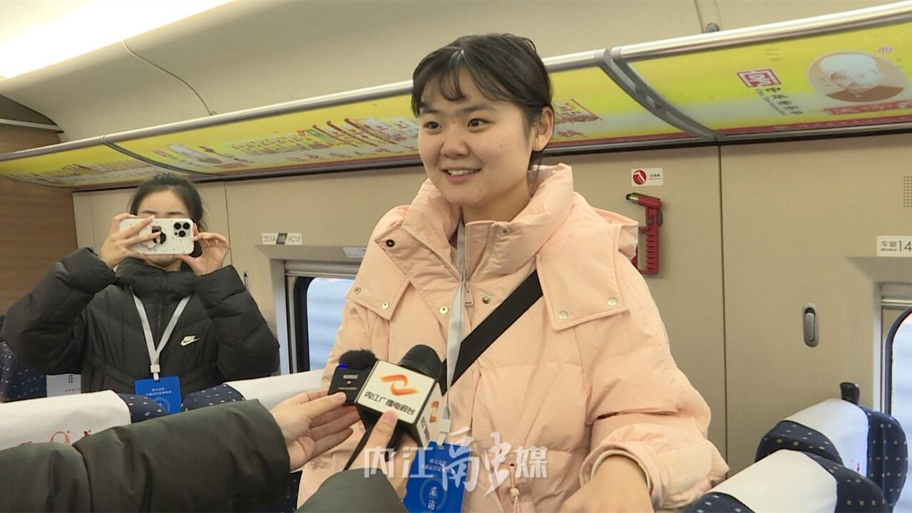 记者李小月:“成宜高铁通车在即,今天呢各相关单位也将组织成宜高铁试乘体验集中采访活动。成宜高铁是四川省境内一条连接成都市、资阳、内江、自贡市与宜宾市的高速铁路。沿途也开设了我们资中西站和威远站。接下来呢我们就将登上这趟55301列车启动我们的试乘体验活动,感受列车沿途的风景。”
