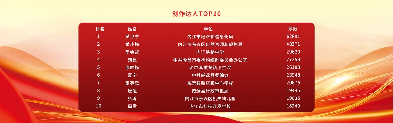 今年5月,内江开展首届“我在‘学习强国’我做‘学习达人’”评选活动,全市“学习强国”注册用户通过写心得、讲故事、晒积分等三种形式积极参与。在创作达人评选方面,共接收“学习强国”注册用户投稿801条次,投稿用户涵盖党政干部、企业职工、普通市民等多类人群。审核通过并发布的稿件在全媒体平台累计产生浏览量超510万人次,单条最高浏览量达24万人次,在11月20日至31日的网络投票阶段,共产生有效票数超82.3万。在积分达人评选方面,今年5月至10月期间,共开展了6次月度排行活动,并在11月进行了最终的积分达人评选,累计共有1.7万人次参与,在排名最前的100名达人中,最高分为84408分,最低分也达到了81267分,体现出了“学习强国”学习平台在我们内江的良好推广应用效果。