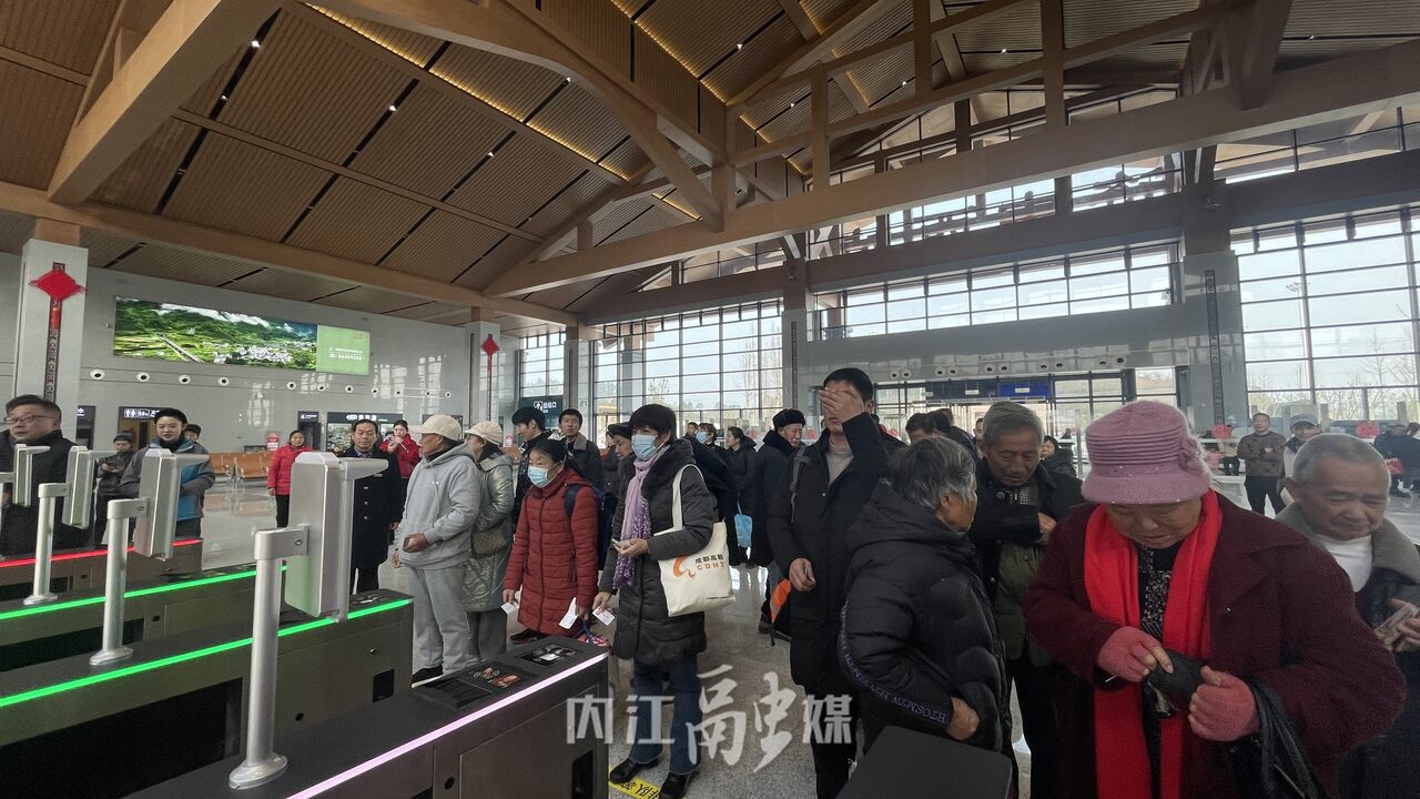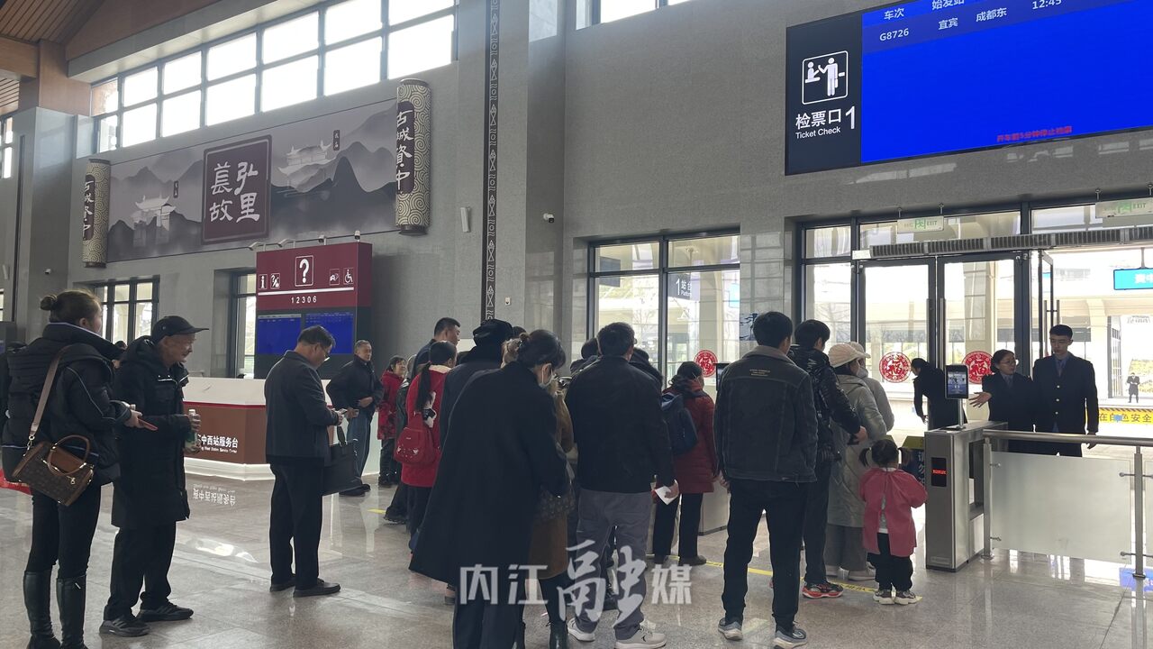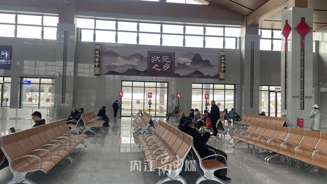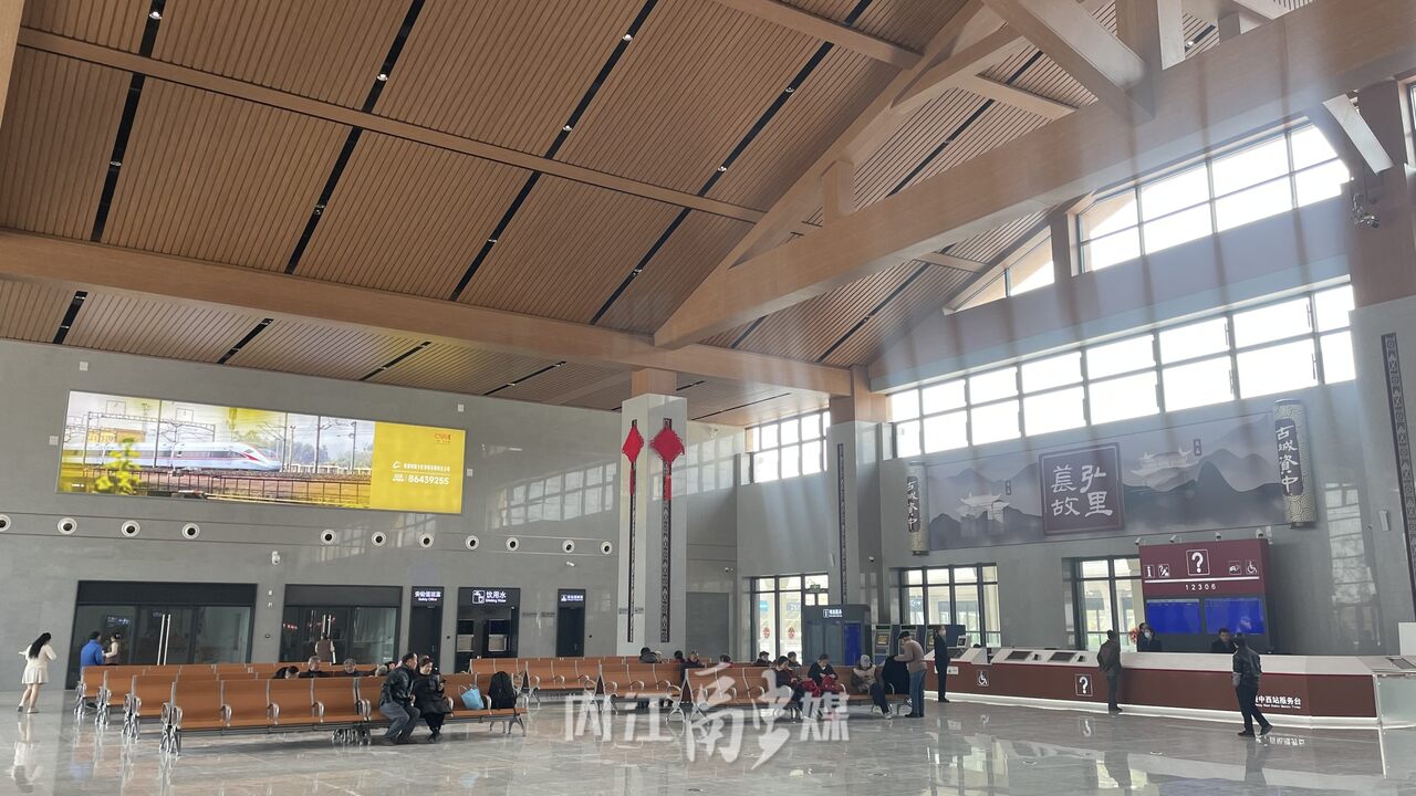 走进站内,高高悬挂的中国结和随处可见的剪纸为即将到来的新年增添了喜庆的氛围。为了迎接旅客的到来,车站已“万事俱备”。“苌弘故里”“状元之乡”两块古城资中的名片分列在检票口两侧。