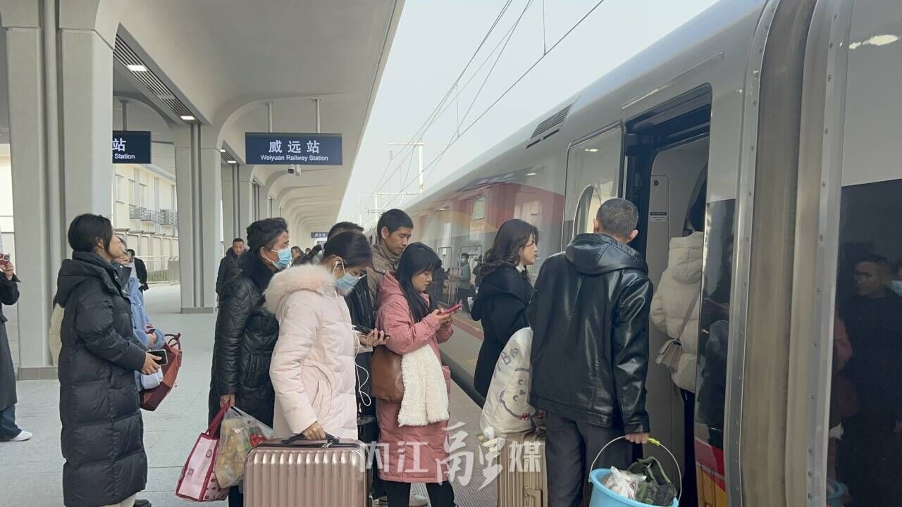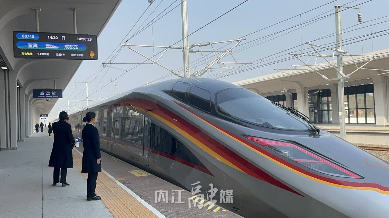 成自宜高铁高速列车首次停靠威远站 乘客坐高铁到蓉城