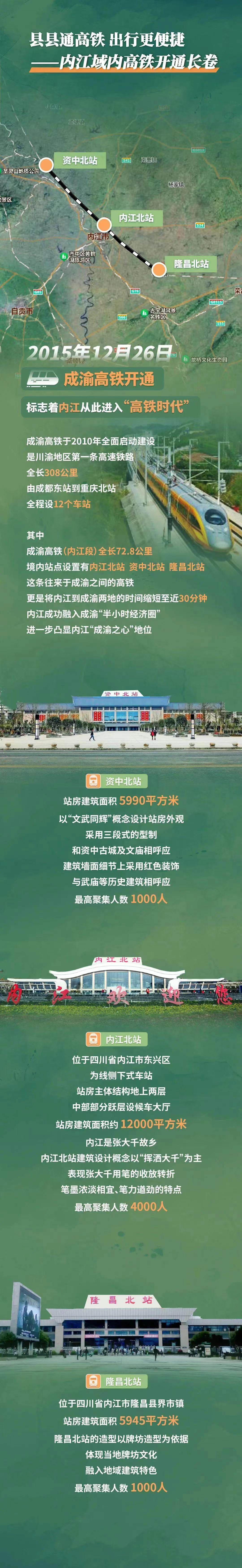 作为全省首条设计时速350公里/小时的高速铁路,成自宜高铁于2018年12月21日开工建设,全长261公里,其中内江段62.5公里。沿线设成都东、天府机场、资阳西、自贡、宜宾东等12个车站,在内江境内设有资中西站和威远站。