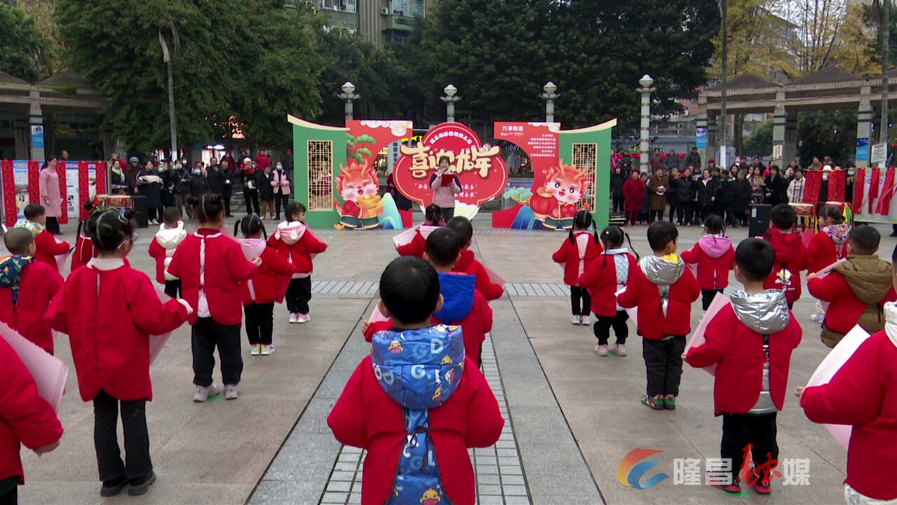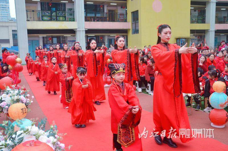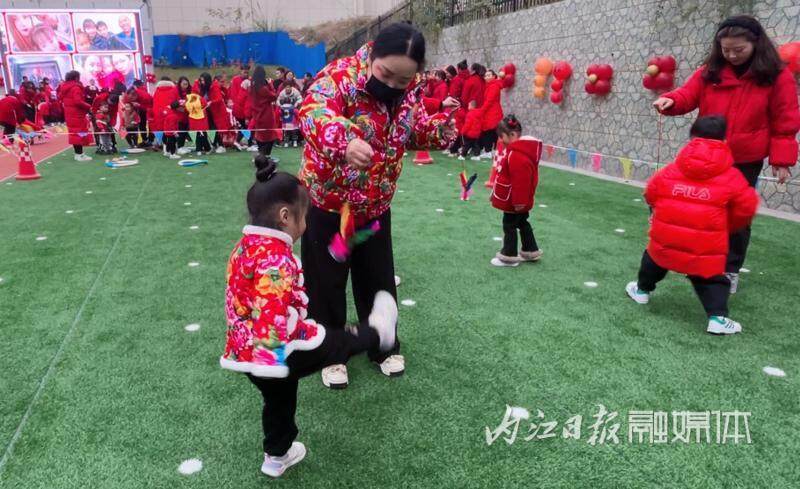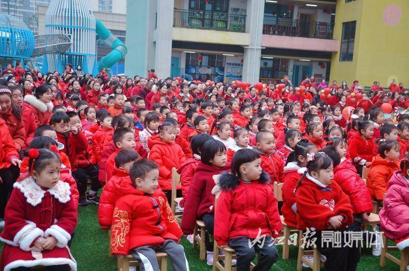 12月25日,内江市实验幼儿园的家长和孩子们身穿有中国元素的喜庆衣服,共赴“‘庙’趣横生 年味满满”的2024年新年亲子庙会活动。